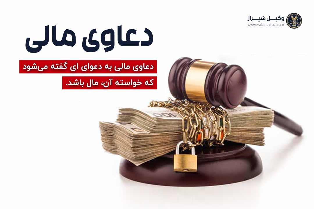 در تعریف کلی، دعاوی مالی به دعوایی اطلاق می‌شود که خواستۀ آن مال باشد، و اجرای آن برای دارنده منجر به منفعت یا پول شود، مانند حق مالکیت خانه. در مقابل، دعاوی غیرمالی آن دسته از دعواست که اجرای آن منفعت مالی در پی نداشته باشد، مانند حق زوجیت، نسب، بنوت و ولایت و… .